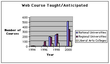 Among those reporting the relevant numbers, the average ratios of the number of Web courses anticipated in 1998 to the number taught in 1997 was 1.79. The average ratio of the number of Web courses anticipated in 2000 to the number taught in 1997 was 8.19. This exhibits an expectation of a doubling time of one year.